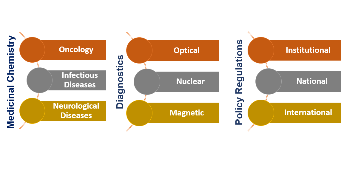 The primary objective of the conference is to advance the discovery and development of therapeutics / radiopharmaceuticals for infectious diseases, neurological disorders, cancer nanobionics, environment & health etc. By providing a platform, the researchers from interdisciplinary areas will interact with the eminent speakers from renowned institutions and laboratories including MIT-SMART, IITs, IISc, DBT labs, DRDO labs, University of California, BIOCEV-Charles University, FIOCRUZ Brazil, and Mayo Clinic Florida. The conference will promote a cross-disciplinary collaboration between scientists, industry, and physicians toward a common goal of achieving better health for the society. This multi-disciplinary conference is intended to expose students and young faculty members to the latest research methodologies, with an emphasis on addressing global problems. The scope of the conference is to sensitize, stimulate and create awareness among young research scholars and scientists from both translational research and clinical arena. The conference will feature keynote lectures on Translational Medicine, Drug Discovery, Chemical Biology, and Cell Biology. The conference will have a special session on Intellectual Property for Healthcare, Academia-Industry Collaboration, Environment & Health. The following main topics will be covered during the symposium: